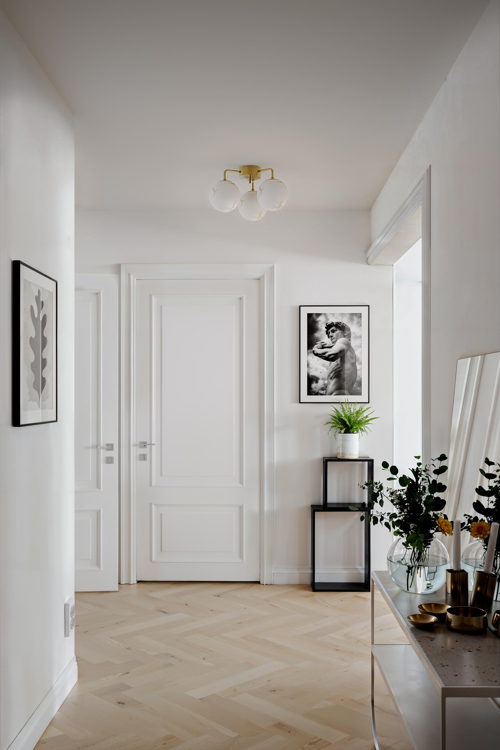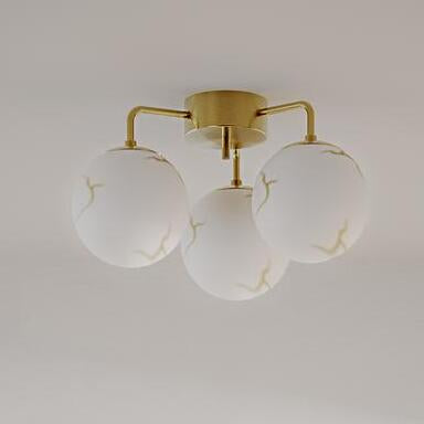 Luksusta modernin klassisessa hengessä. Antiikkimessinkinen runko ja marmoroidut opaalilasikuvut suodattavat valon pehmeäksi, tasaiseksi hehkuksi. Ø50 cm kattoplafondi toimii erityisen hyvin matalissa tiloissa sopien yleisvaloksi eteiseen, olohuoneeseen, keittiöön tai makuuhuoneeseen. Katosta vain 27 cm, joten tilat pysyvät avarina. Kokonaisuus on yhtä aikaa ajaton ja näyttävä; yhdistä lämpimiin puusävyihin, travertiinikiveen ja messinkisiin yksityiskohtiin.