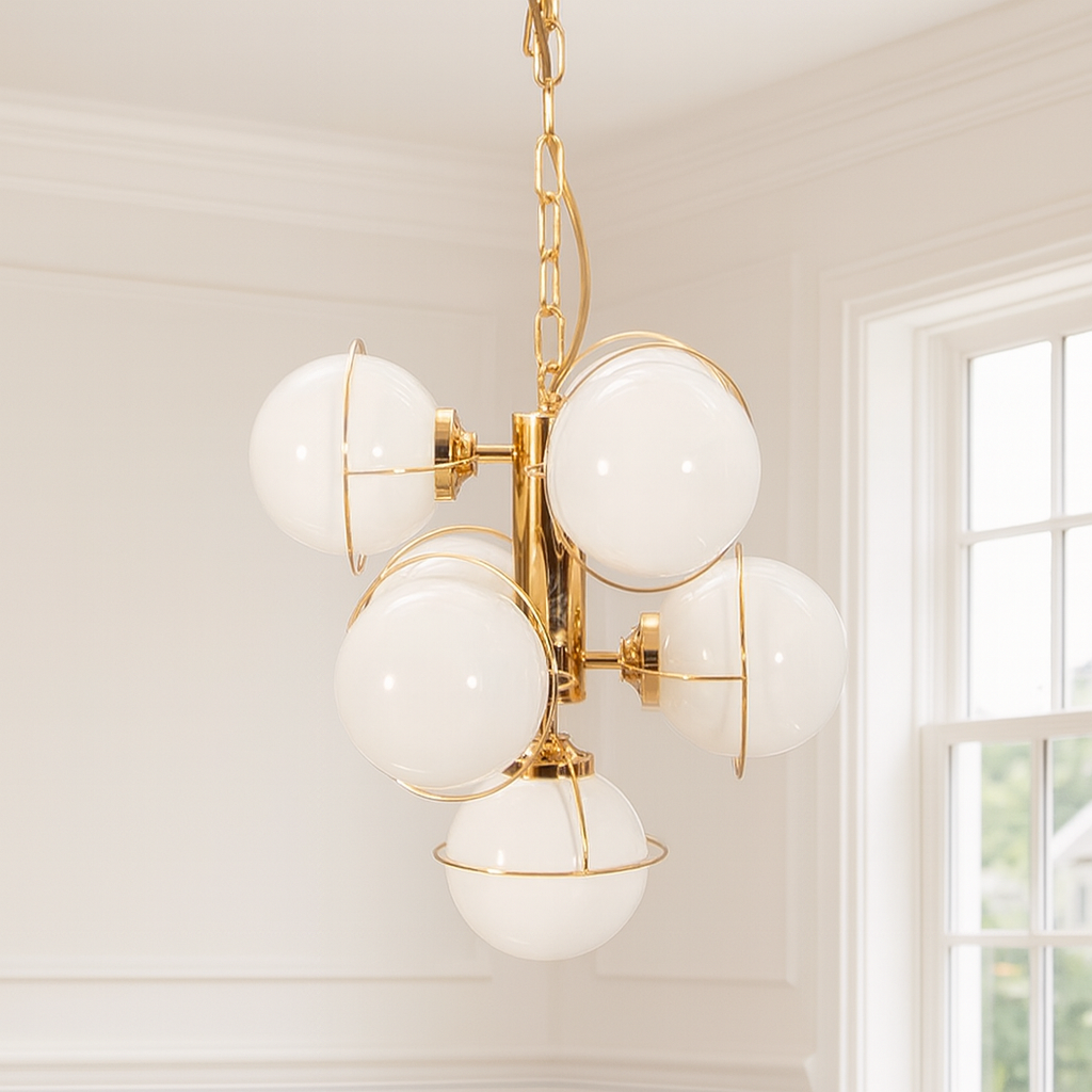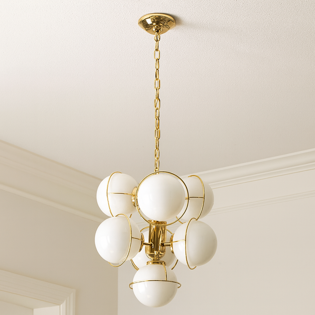 Valaisin on kunnioitettava katseenkerääjä: näyttävä muotoilu, lämminsävyinen messinki ja tasaisesti valaisevat kupupallot luovat elegantin kokonaisuuden, joka sopii sekä moderniin että retrohenkiseen sisustukseen. Mukana on valmistajan alkuperäinen tarra, joka vahvistaa valaisimen alkuperän ja keräilyarvon.