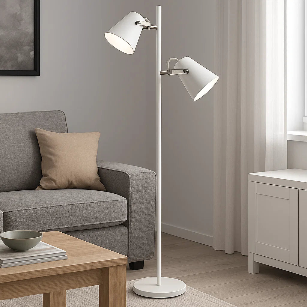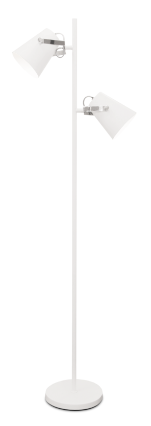 Upea, moderni lattiavalaisin kahdella suunnattavalla kuvulla mahdollistaa valon monipuolisen suuntaamisen. Sopii upeasti lisävaloksi esimerkiksi olo- tai makuuhuoneeseen. Valkoinen metallirunko ja varjostimet, krominväriset somisteet. Kytkin johdossa lattialla, yksi kytkin eli molemmat valot syttyvät samaan aikaan.