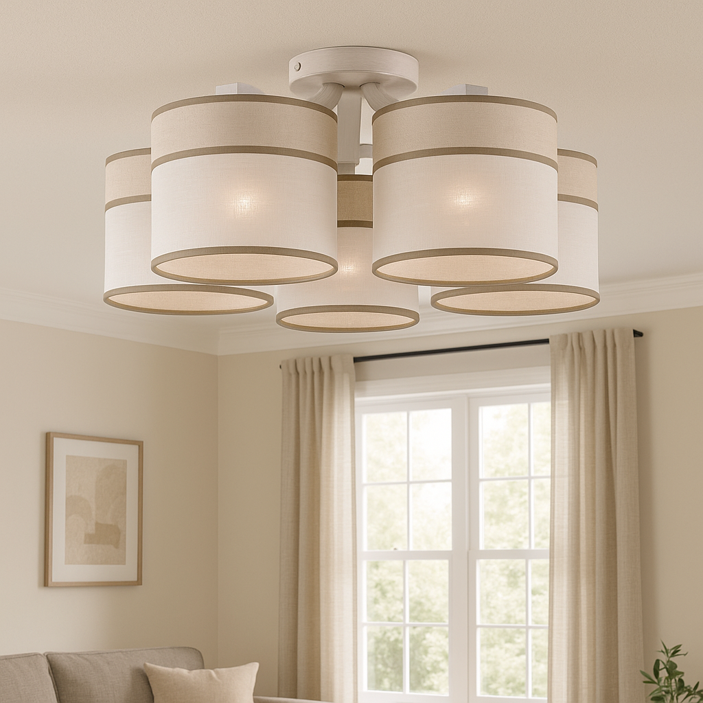Kaunis pyökkipuinen kattovalaisin, jossa tekstiiliset varjostimet. valonlähteitä yhteensä 5 kappaletta. tekstiili päästää valoa pehmeästi läpi. Sopii erinomaisesti matalampaankin tilaan, sillä valaisimen korkeus on vain 23cm. Sopii asennettavaksi kaikkiin pohjoismaisiin asuntoihin. Kiinteä asennus koukkukannen tilalle.