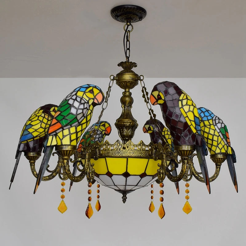 Käsintehty Tiffany-kattokruunu "Papukaijat"