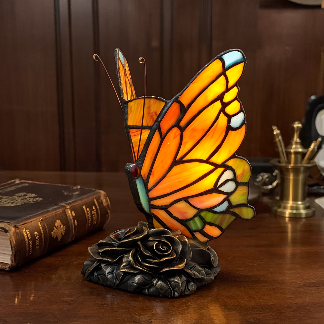 Tiffany Perhonen pöytävalaisin 20 cm x 10 cm. Tunnelmallinen maalattu lasinen kupu. Tämä kaunis valaisin sopii niin olohuoneeseen kuin makuuhuoneen somistukseksi. Valaisimessa on katkaisija johdossa.